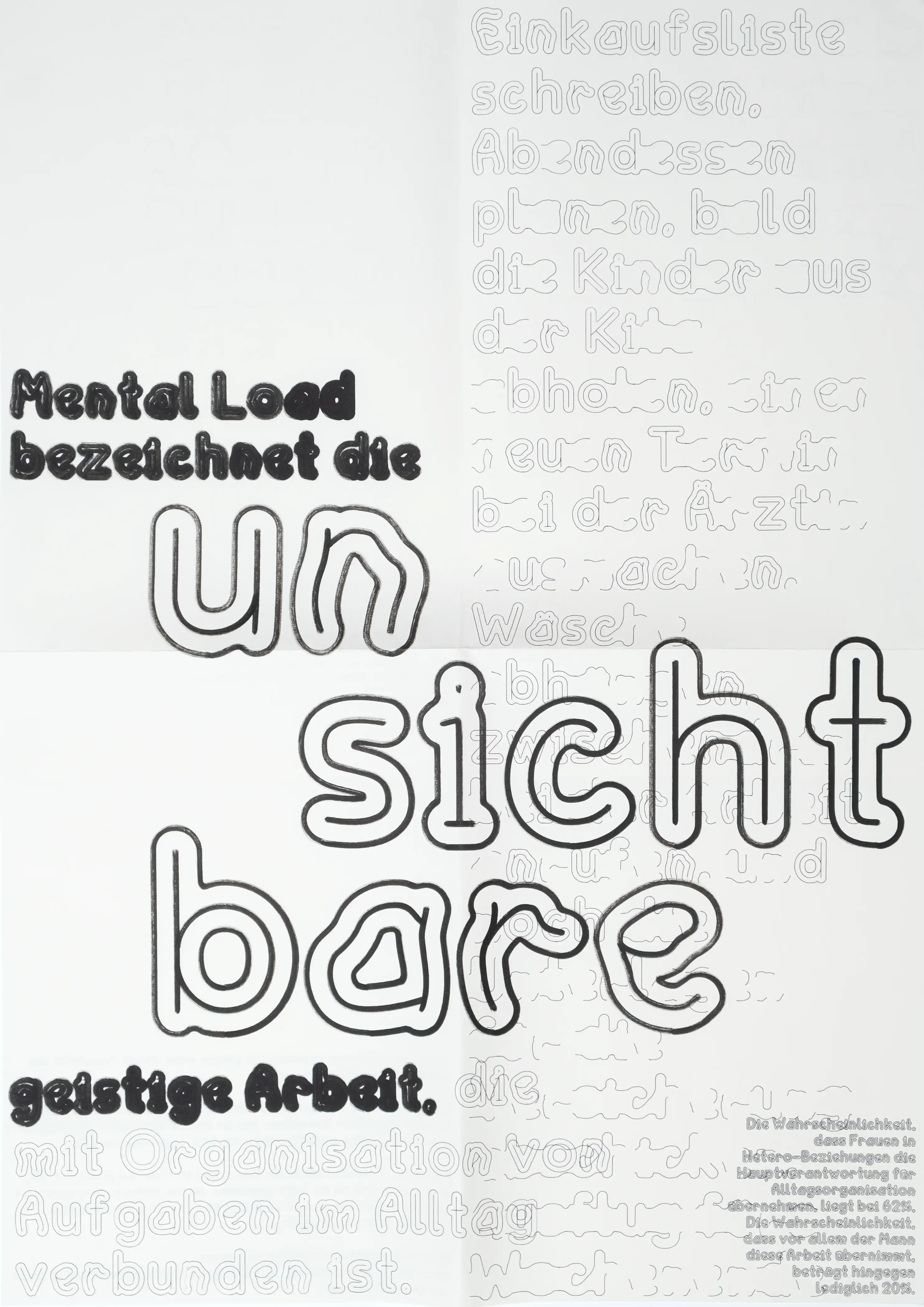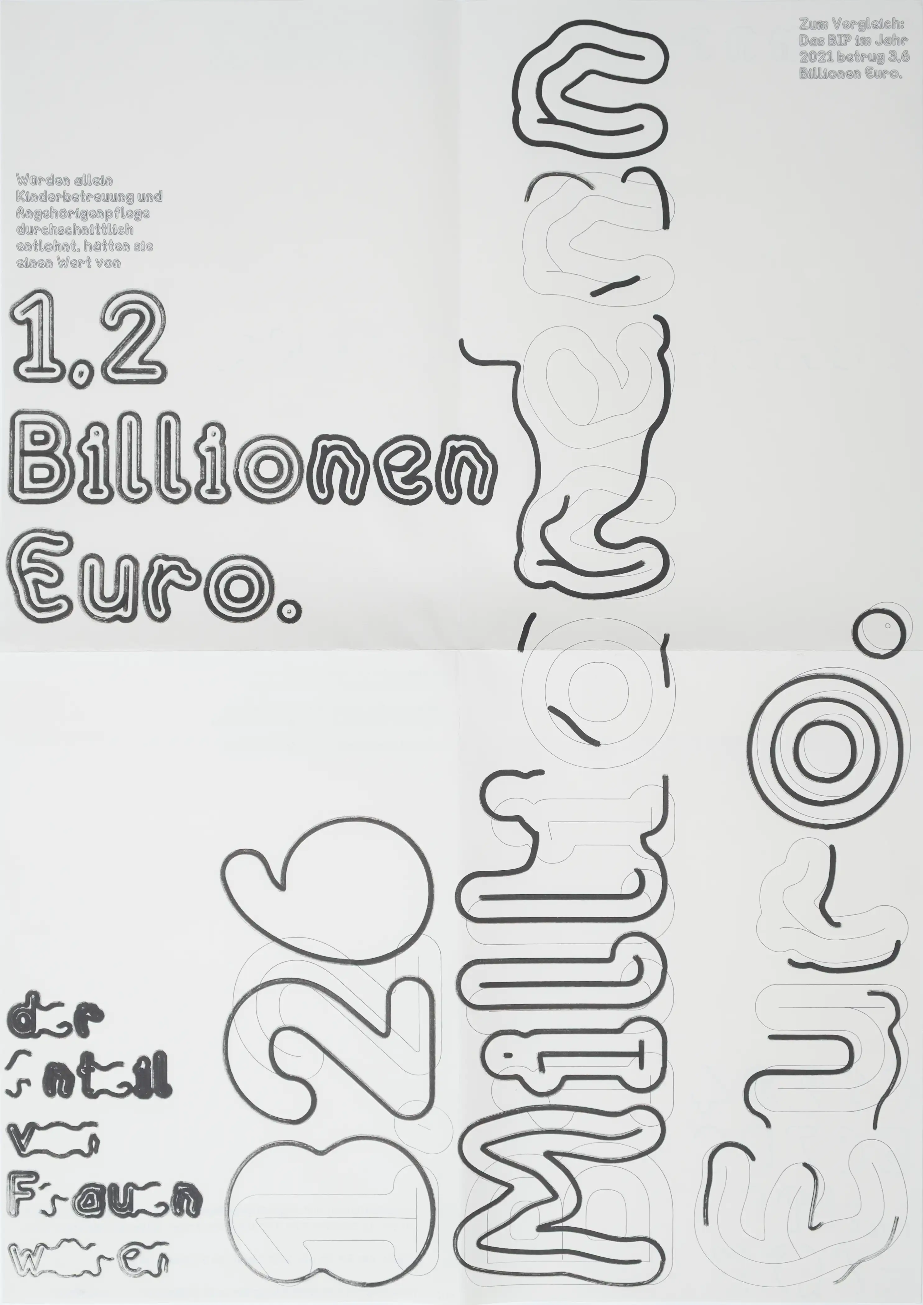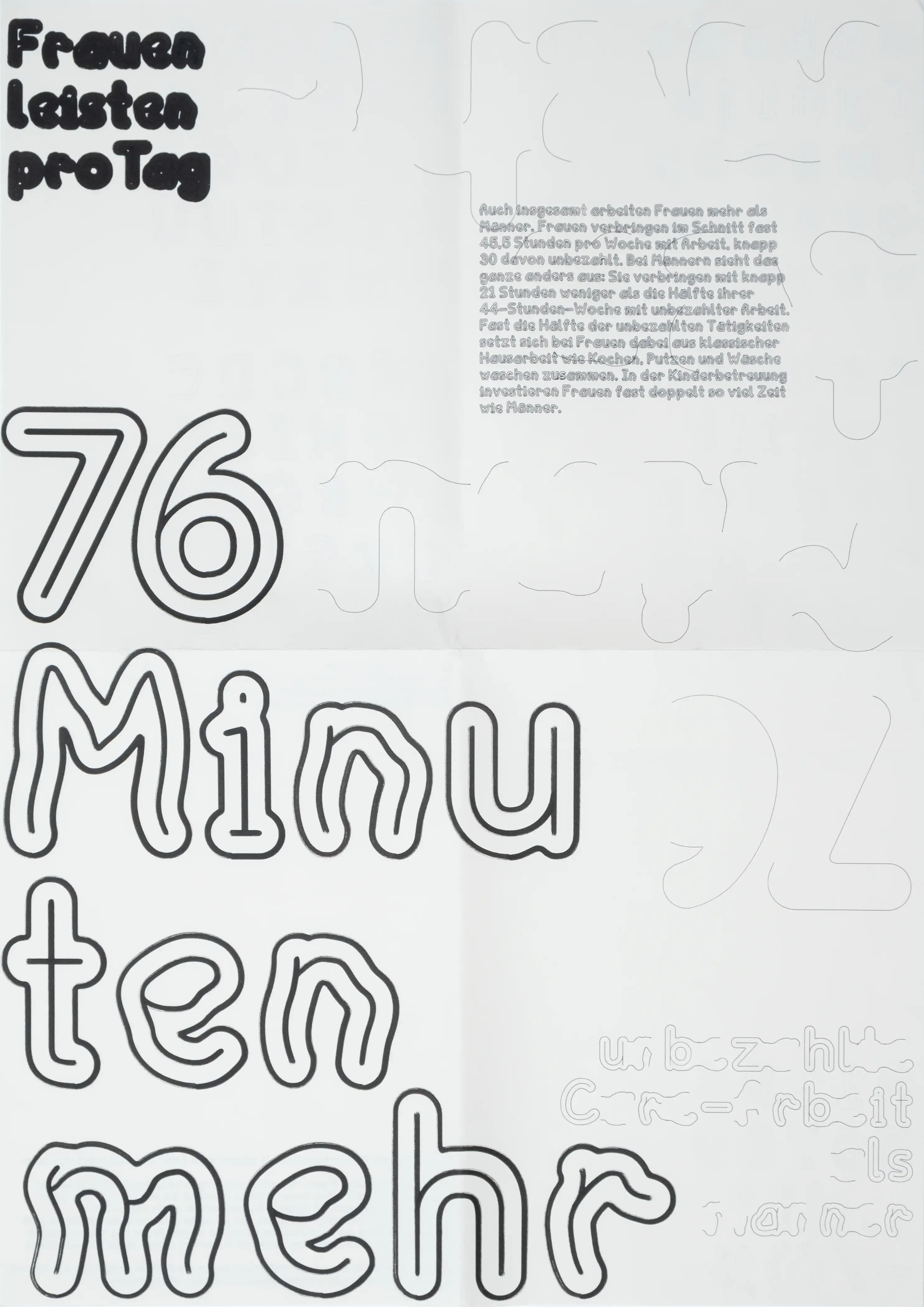 Die daraus entwickelte Schrift bildet die Grundlage für eine Plakatreihe, die ihre konzeptuellen Ursprünge sichtbar macht. Der bewusste Einsatz eines Penplotters überträgt den kleinteiligen, zeitintensiven und oft unterschätzten Charakter von Care-Arbeit auf den Produktionsprozess selbst.